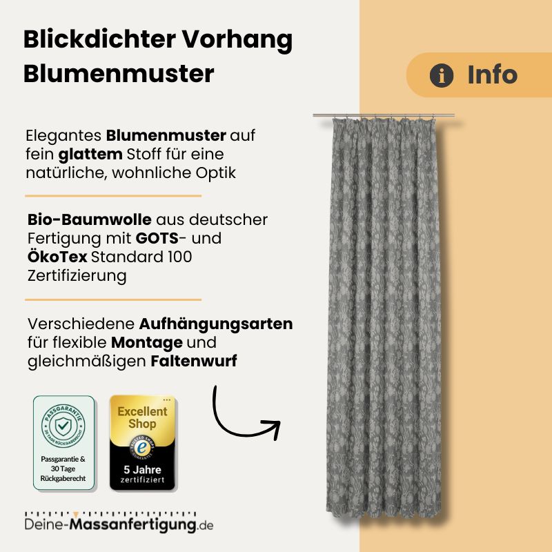 Unser Vorhang aus 100% Bio-Baumwolle wird in Deutschland gefertigt und trägt sowohl das GOTS- als auch das ÖkoTex Standard 100-Zertifikat. Diese Qualitätsmerkmale garantieren den Einsatz ausschließlich biologisch erzeugter Materialien und umweltverträglicher Farbstoffe. Mit einer feinen und glatten Oberfläche bietet der Vorhang eine leichte Lichtdurchlässigkeit und schützt vor ungewollten Einblicken. Das elegante Blumenmuster verleiht dem Raum eine natürliche Note und ermöglicht vielseitige Kombinationsmöglichkeiten mit anderen Dekorationselementen. Mit der im Stoff eingearbeiteten Aufhängung ermöglichen wir Ihnen einen gleichmäßigen Faltenwurf, den Sie nach Belieben anpassen können. Dank seiner pflegeleichten Eigenschaften ist der Vorhang bei 60 Grad in der Maschine waschbar und trocknergeeignet. Hierbei ist es völlig normal, dass der Vorhang bei der ersten Wäsche einläuft. Der Schrumpf von ca. 5% wird in der Konfektionierung berücksichtigt, sodass Sie einen etwas größeren Vorhang erhalten als angegeben.