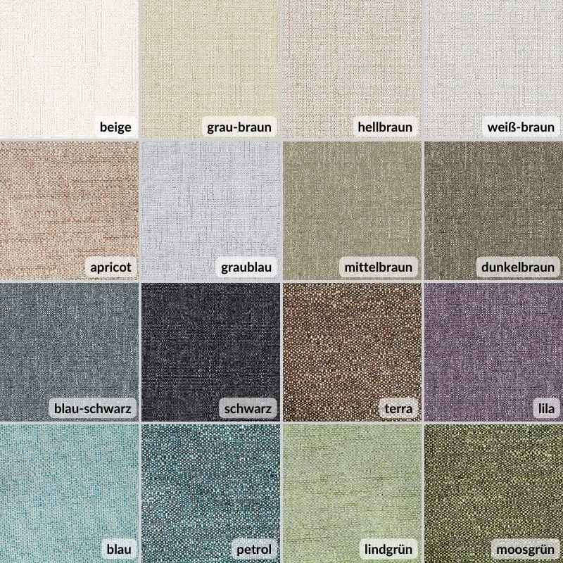 Wir nutzen unterschiedliche Materialien in der Herstellung unserer Maßprodukte. Die jeweiligen Materialien entnehmen Sie bitte der Artikelbeschreibung. Falls Sie die Struktur der Stoffe vor dem endgültigen Kauf fühlen möchten oder sich zwischen mehreren Farben nicht entscheiden können, verweisen wir auf den nächsten Punkt.