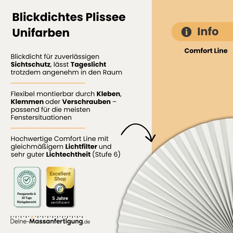 Unser blickdichtes Plissee der Comfort Line begeistert durch ein klassisches, zeitloses Design, das in nahezu jede Raumgestaltung passt. Der Stoff lässt genügend Licht hindurch, um den Raum hell und freundlich zu halten, während er zugleich für Zuverlässigen Sichtschutz sorgt. Dank der bewährten Cosiflor-Technik und flexibler Befestigungsoptionen ist dieses Plissee langlebig und vielseitig einsetzbar – die ideale Wahl für Wohn-, Schlaf- oder Arbeitsbereiche.