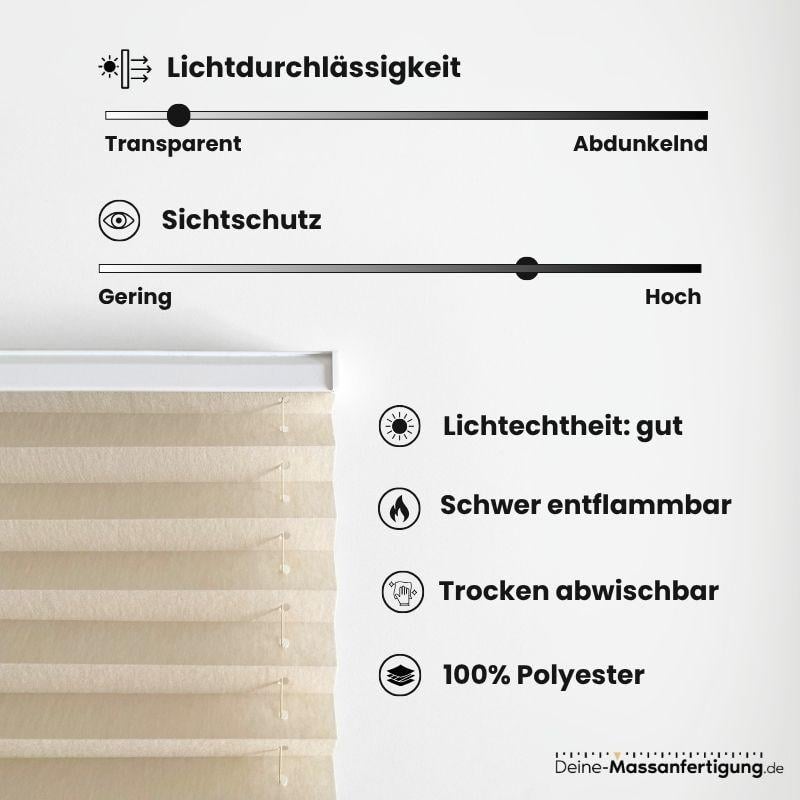 Qualität des Materials: Unsere Plissees sind aus hochwertigen Materialien gefertigt, die robust und langlebig sind und tendieren daher dazu, länger zu halten als solche minderer Qualität.