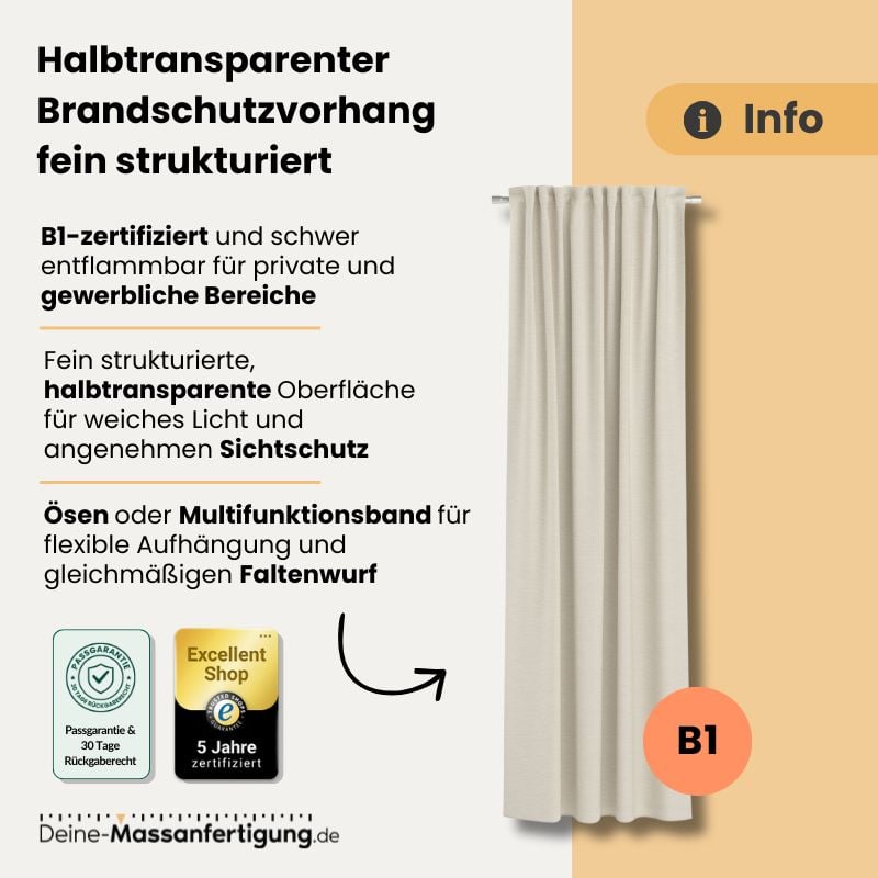 Dieser halbtransparente Vorhang vereint modernes Design mit geprüfter Sicherheit. Gefertigt aus 100 % Polyester in schwer entflammbarer Qualität (B1 zertifiziert), erfüllt er wichtige Brandschutzanforderungen und eignet sich ideal für den Einsatz in öffentlichen oder gewerblichen Räumen sowie im privaten Wohnbereich.