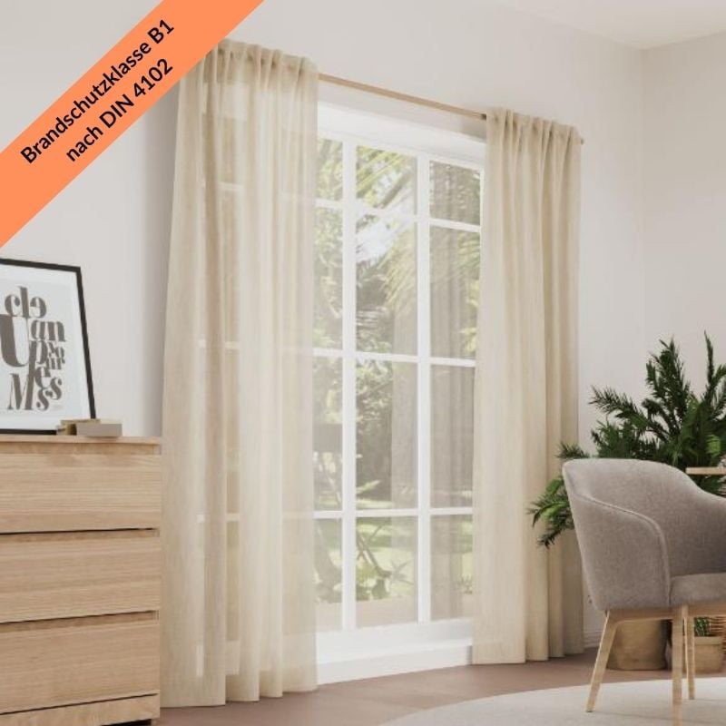 Dieser halbtransparente Vorhang bringt eine gemütliche, natürliche Atmosphäre in jeden Raum – und das mit geprüfter Sicherheit. Der Stoff besteht aus 100 % schwer entflammbarem Polyester und erfüllt damit wichtige Brandschutzanforderungen (B1 zertifziert) – ideal für Wohnräume, Büros oder öffentliche Bereiche.