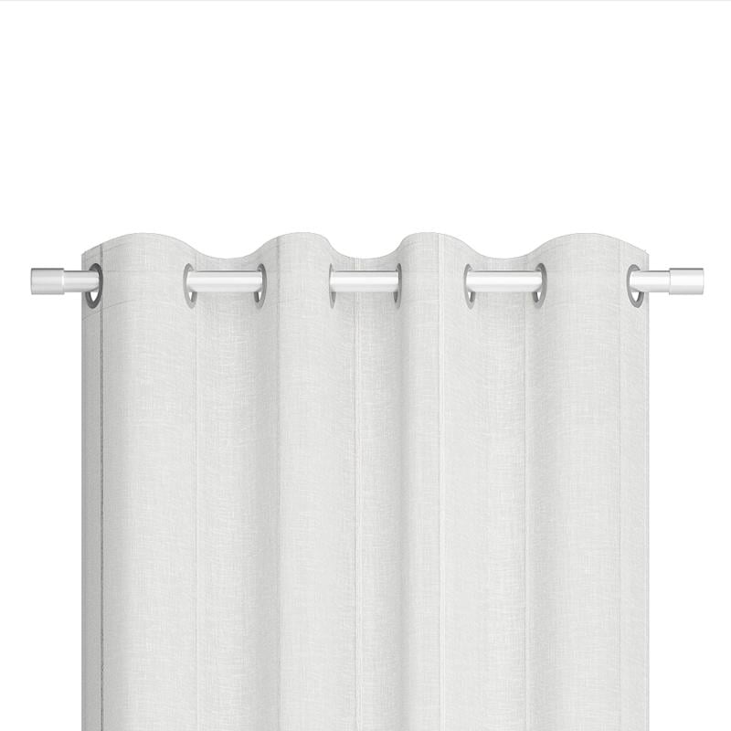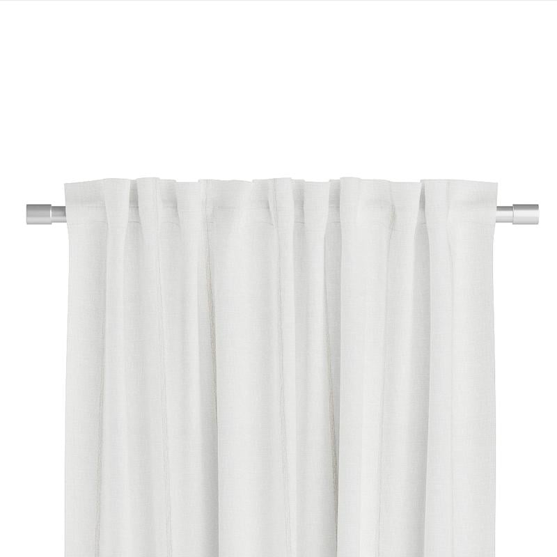 Die angegebene Breite bezieht sich immer auf die tatsächliche Stoffbreite des Vorhangs. Wird der Vorhang aufgehangen, reduziert sich die Breite des Stoffes aufgrund des Faltenwurfs. Daher sollte die Stoffbreite größer gewählt werden als die Breite des Fensters.