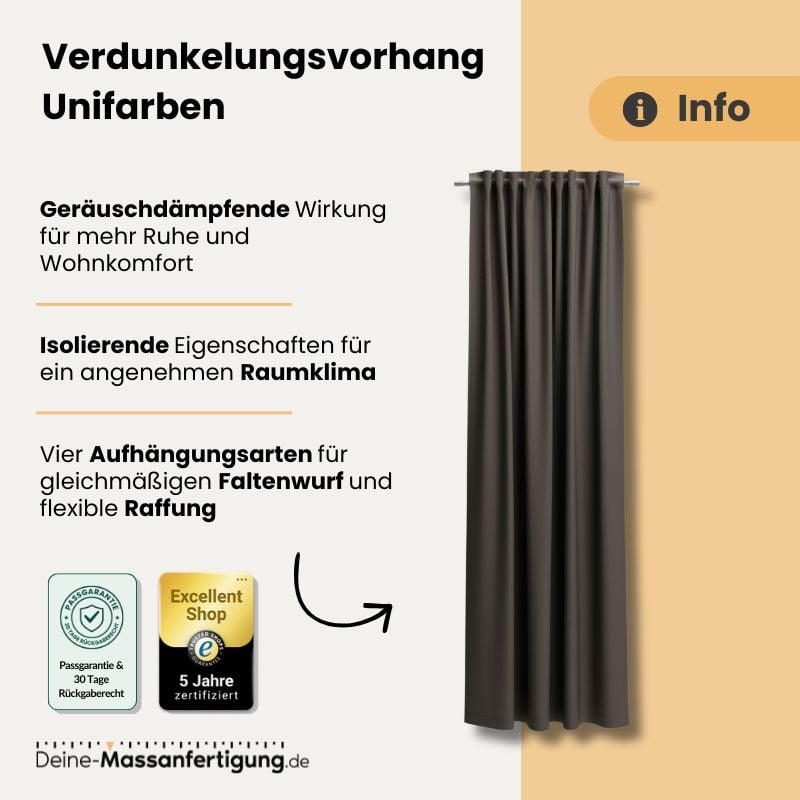 Eine elegante Lösung für Ihr Zuhause bietet der Verdunkelungsvorhang Unifarben. Hergestellt in der EU aus hochwertigem 100% Polyester mit einem Stoffgewicht von 225 g/m² sorgt er nicht nur für Dunkelheit, sondern dank seiner geräuschdämpfenden Wirkung auch für Ruhe. Wählen Sie aus 4 verschiedenen Aufhängungsarten die passende für Ihren Wohnraum aus. Das verdunkelnde Material und die isolierenden Eigenschaften halten Ihre Räume angenehm temperiert. Das eingenähte Band bzw. die Ösen garantieren einen gleichmäßigen Faltenwurf, während Sie das Raffverhältnis nach Belieben anpassen können. Kombinierbar mit verschiedenen Dekorationselementen, bietet dieser Vorhang Stil und Funktionalität zugleich. Bitte achten Sie darauf, dass Sie bei einer Höhe des Vorhangs über 350 cm ausreichend Gardinenhaken verwenden, da der Stoff ein hohes Gewicht aufweist.